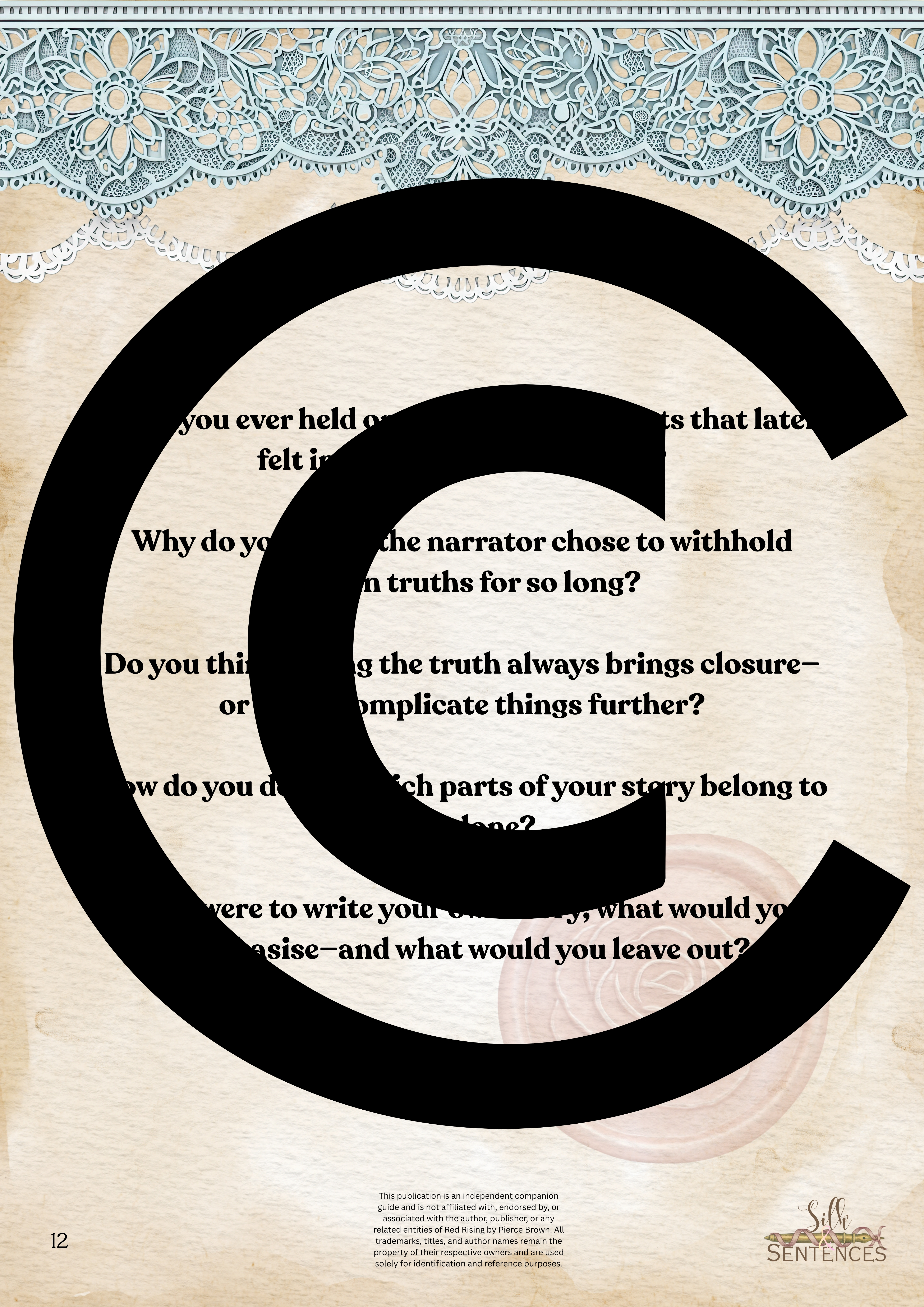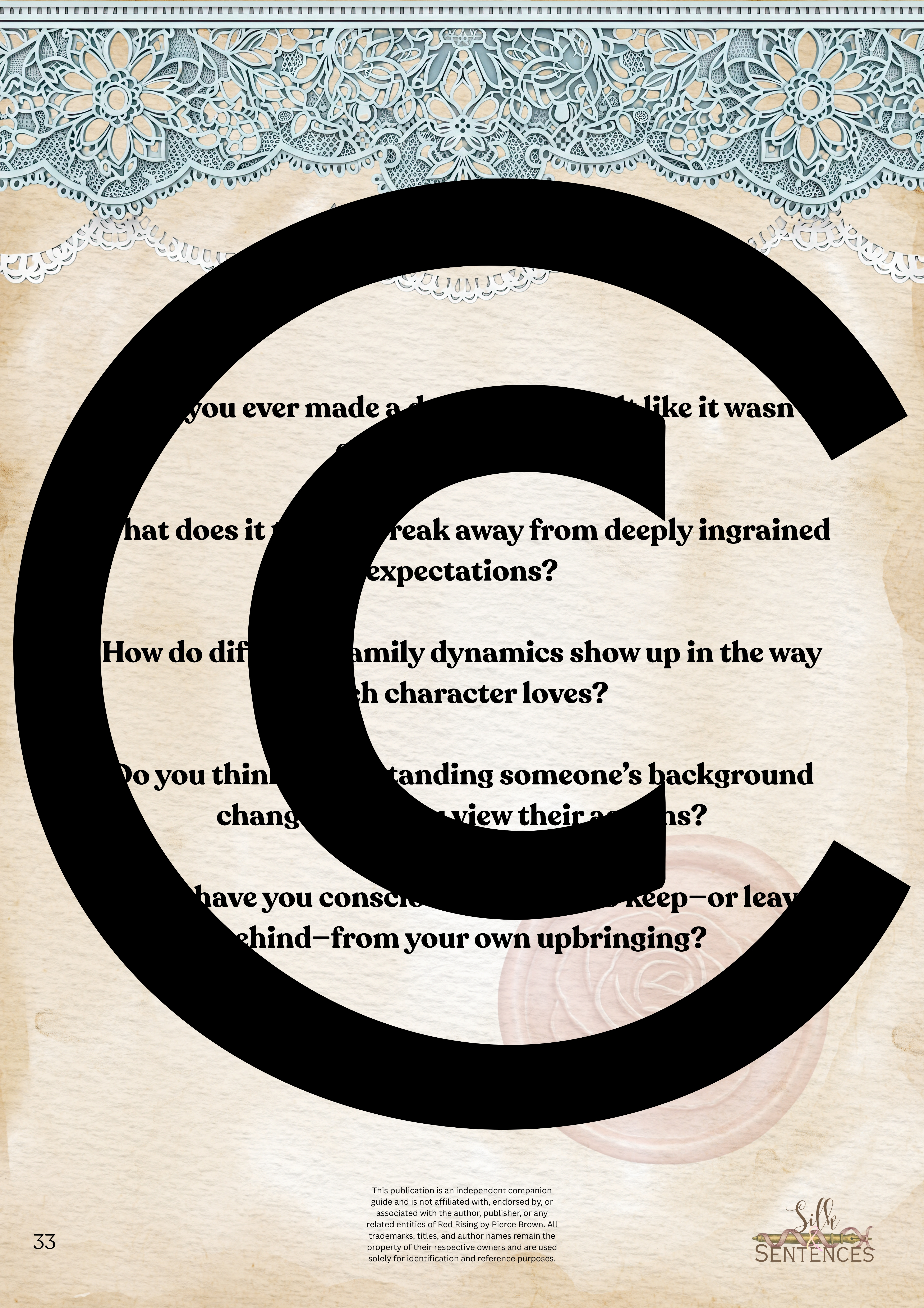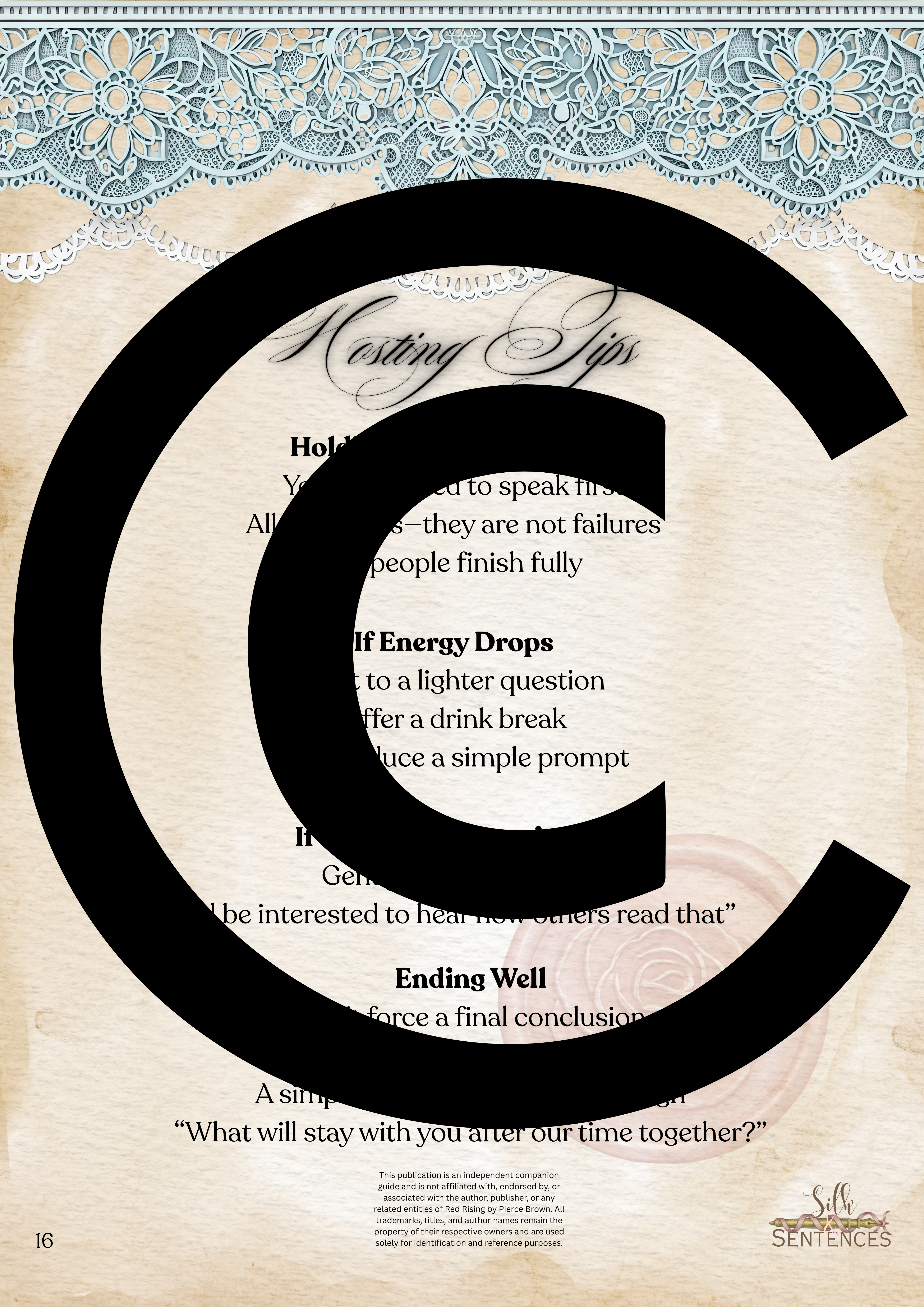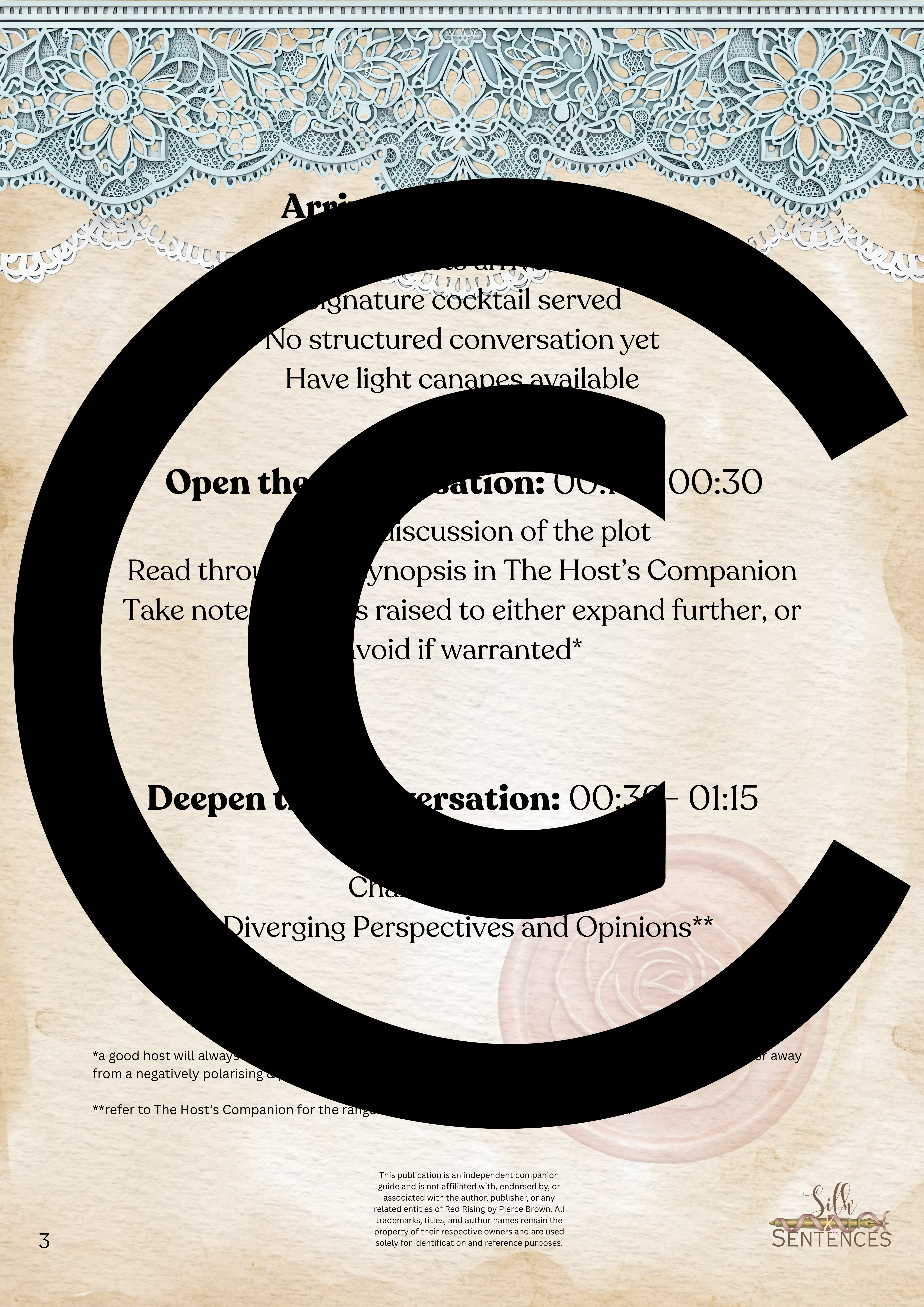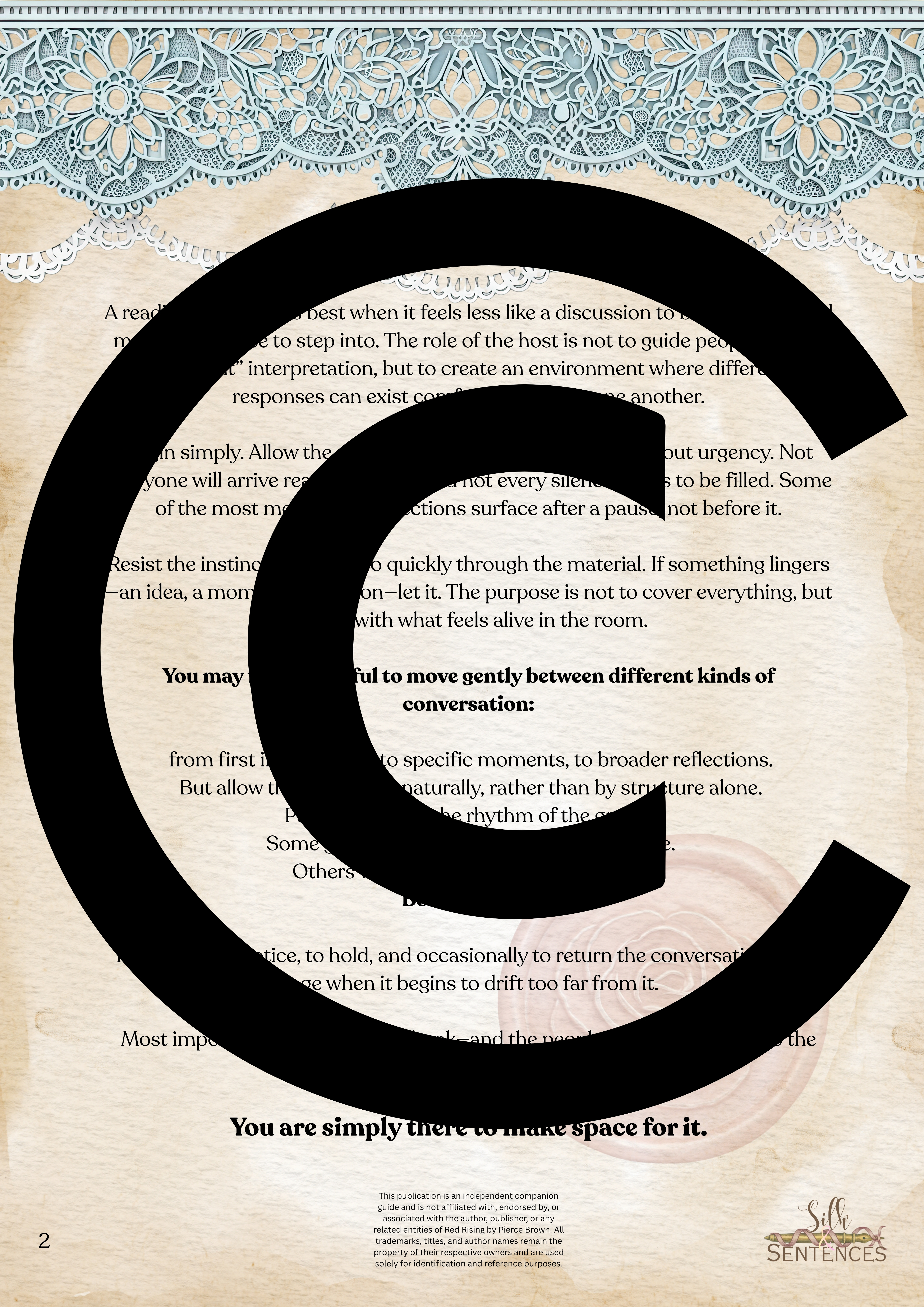 This is an indispensable addition to any Book Club event. Filled with insightful discussion questions, intriguing insights into plot development, emerging themes and character structure, there will be multiple options and avenues to enhance discussion and grow together through the immersion into the accompanying book. Available in conjunction with The Complete Collection, or the Gathering Edition.