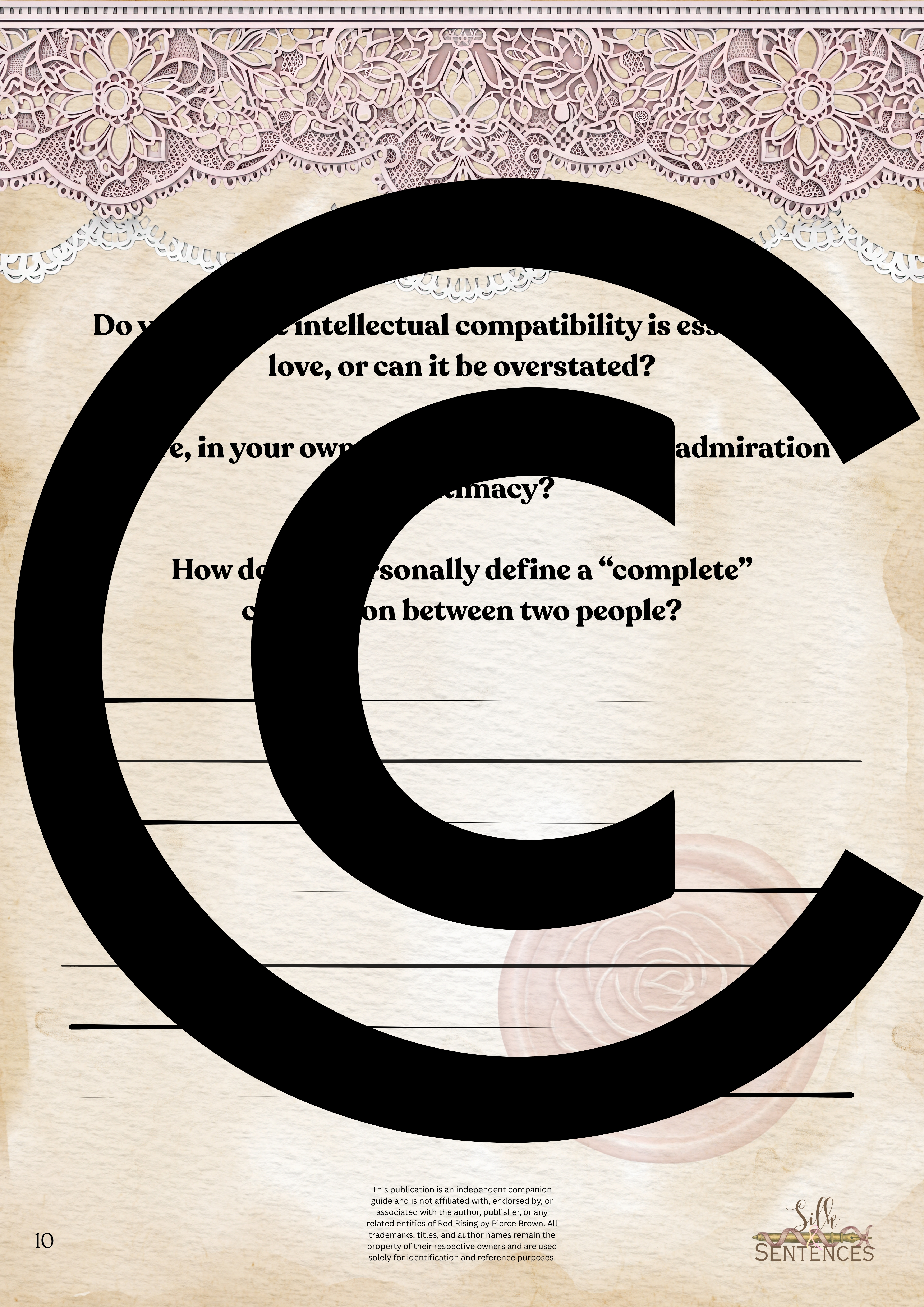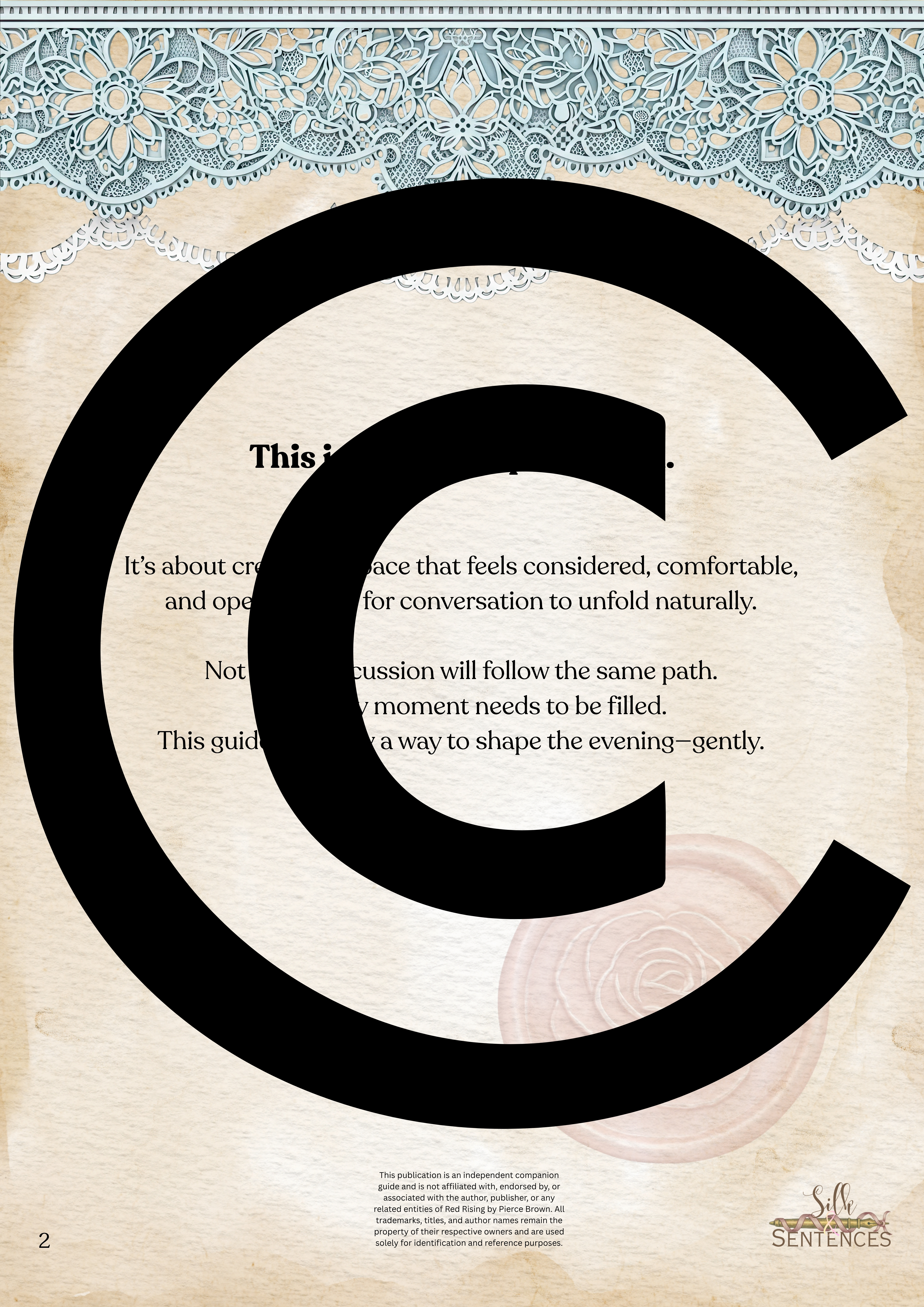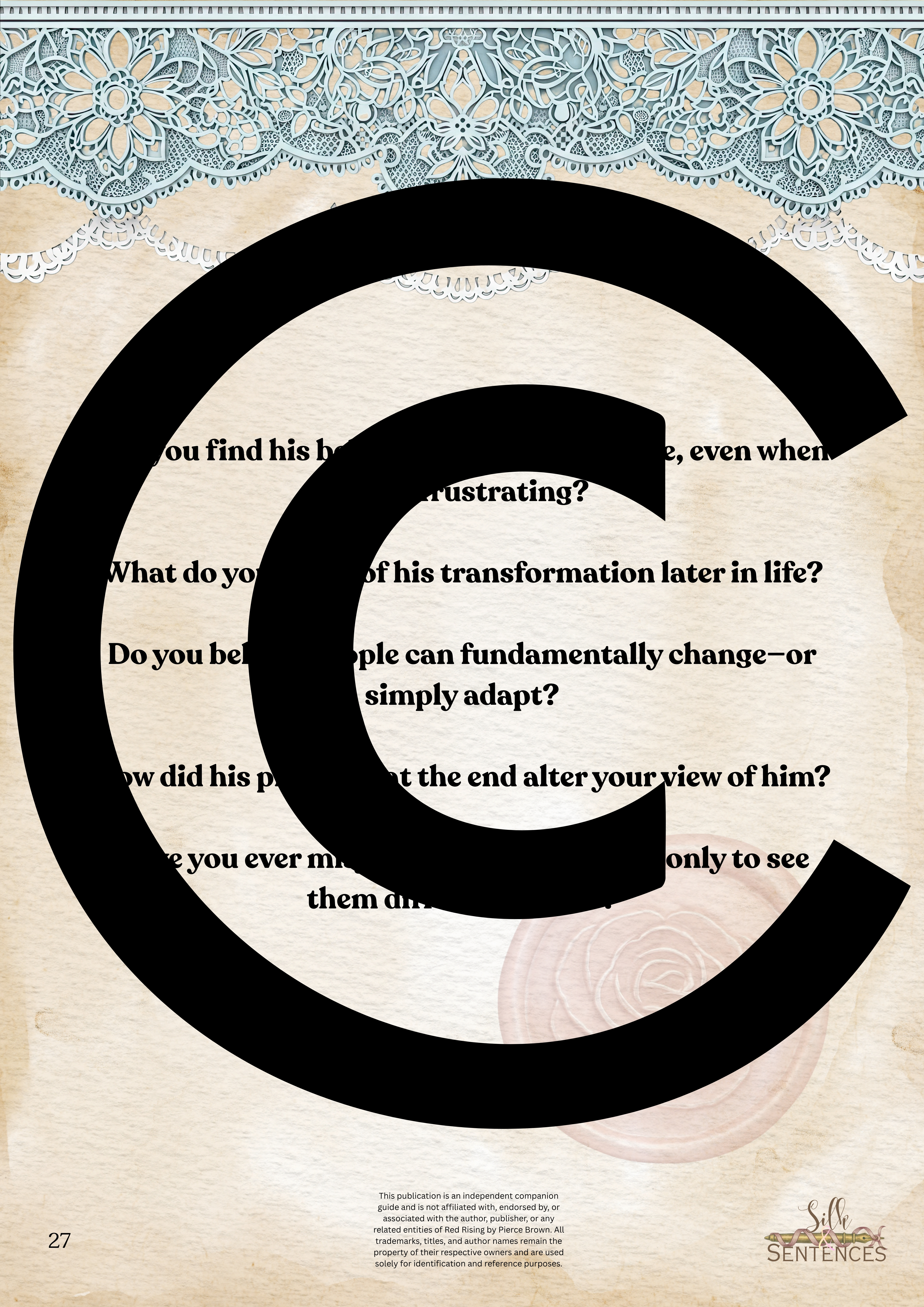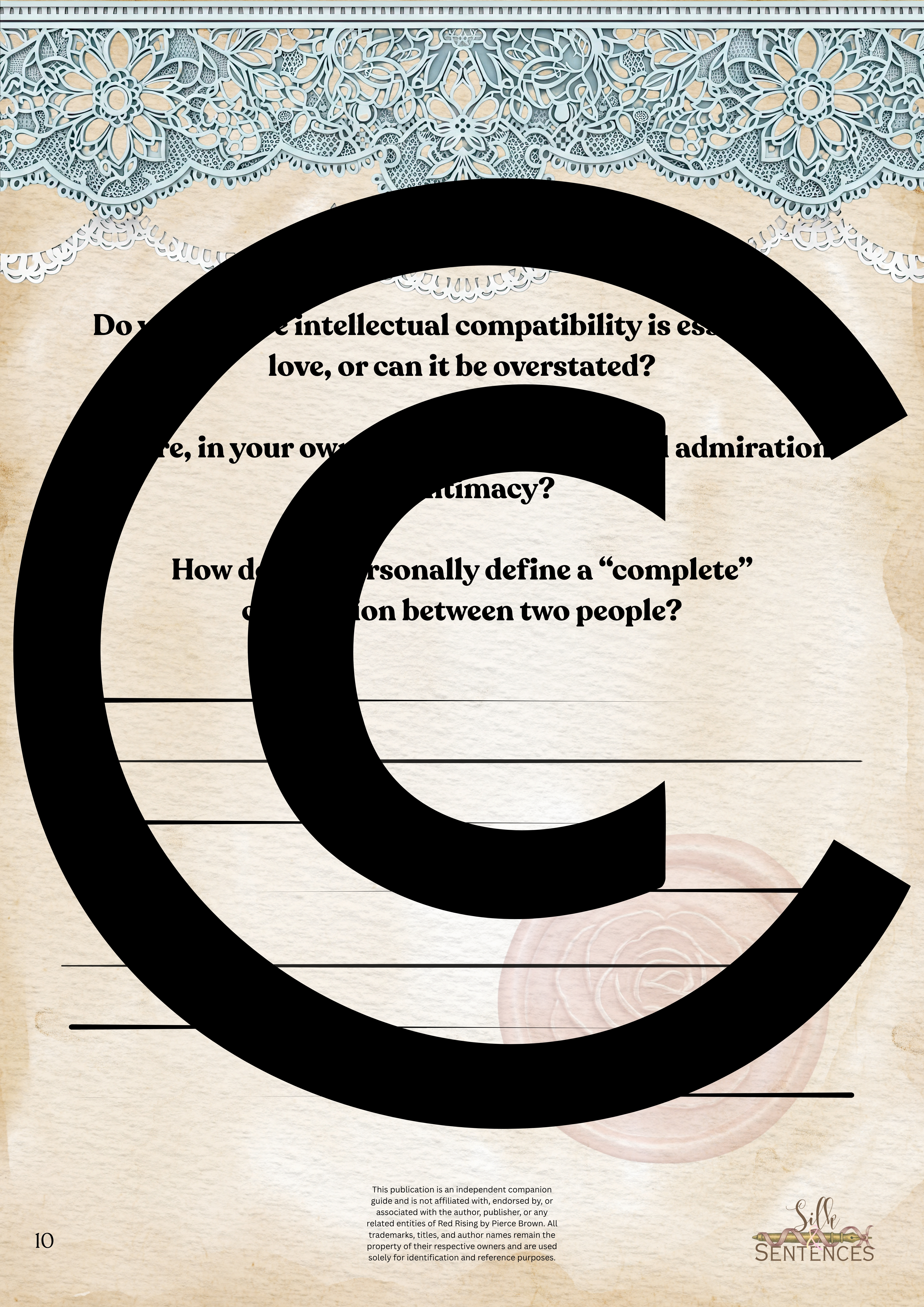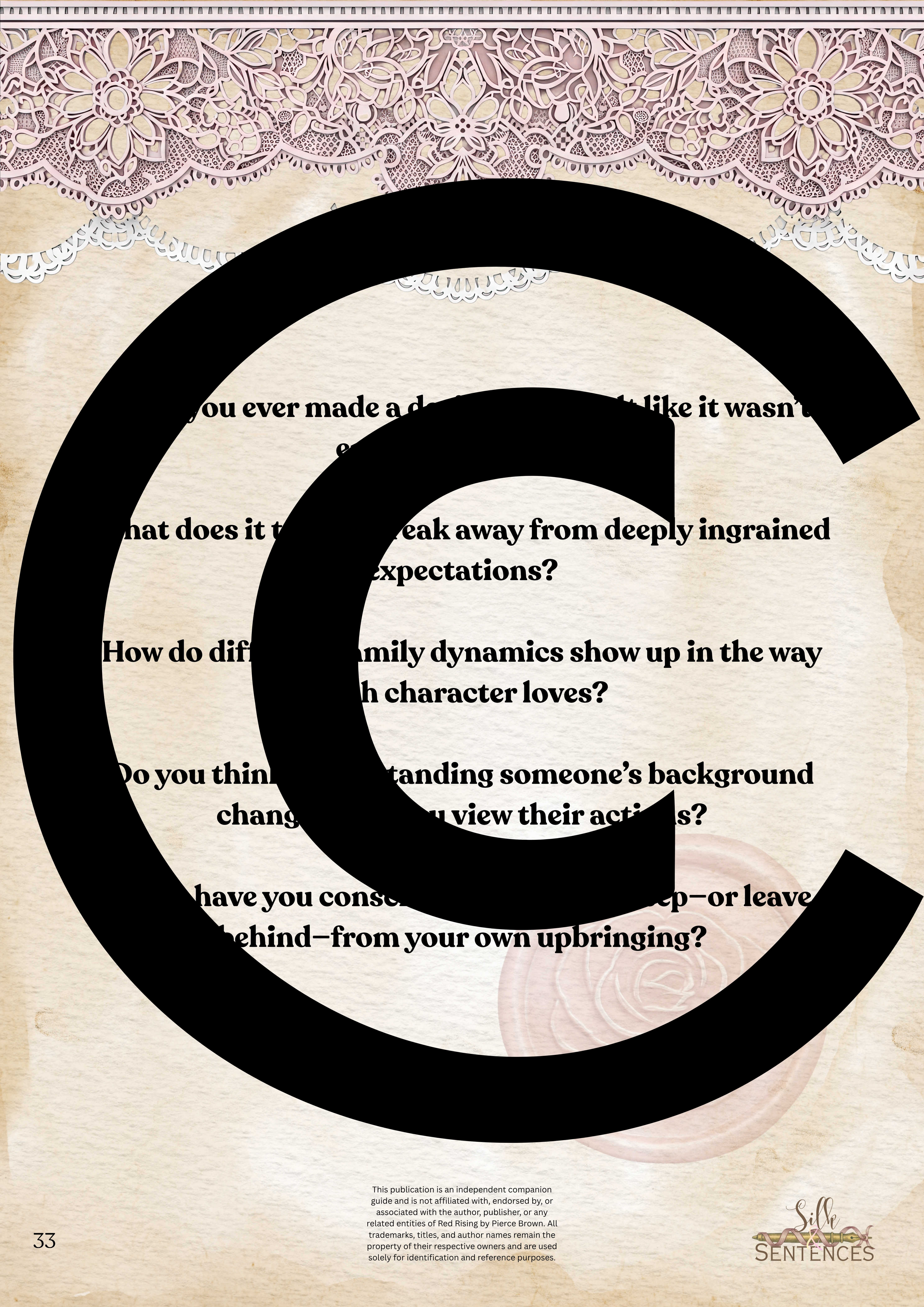 This is an indispensable addition to any Book Club event. Filled with insightful discussion questions, intriguing insights into plot development, emerging themes and character structure, there will be multiple options and avenues to enhance discussion and grow together through the immersion into the accompanying book. Available in conjunction with The Complete Collection, or the Gathering Edition.