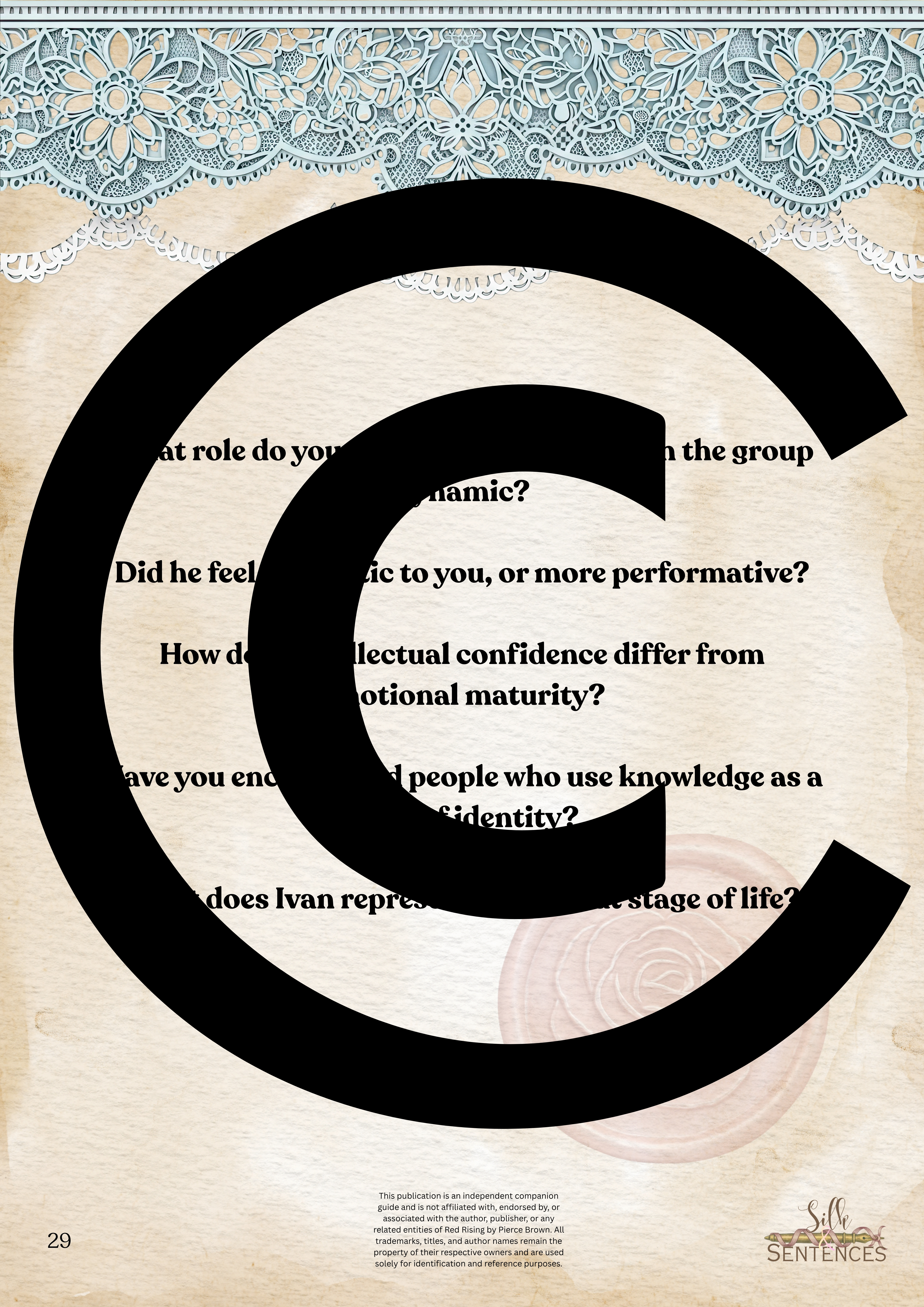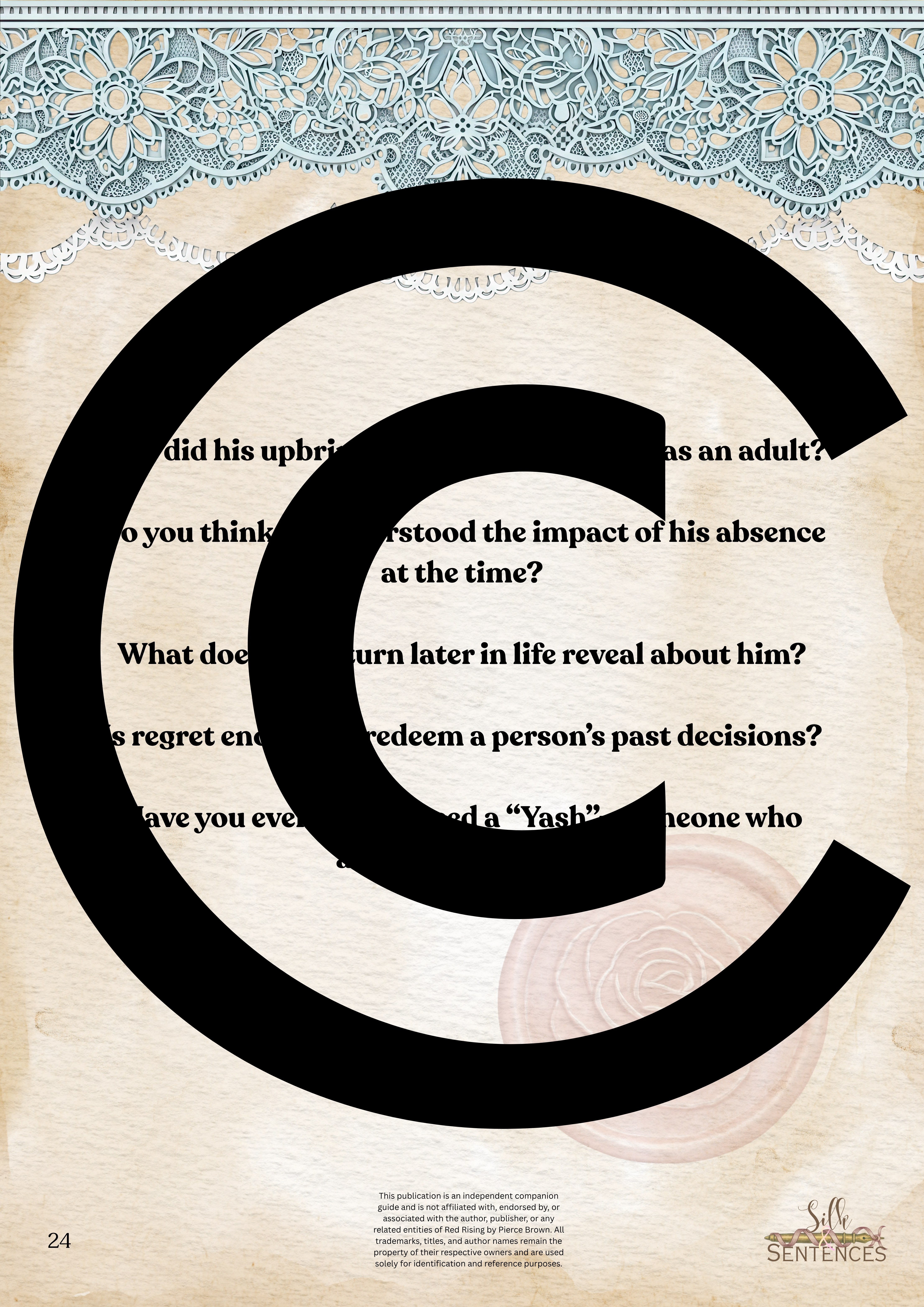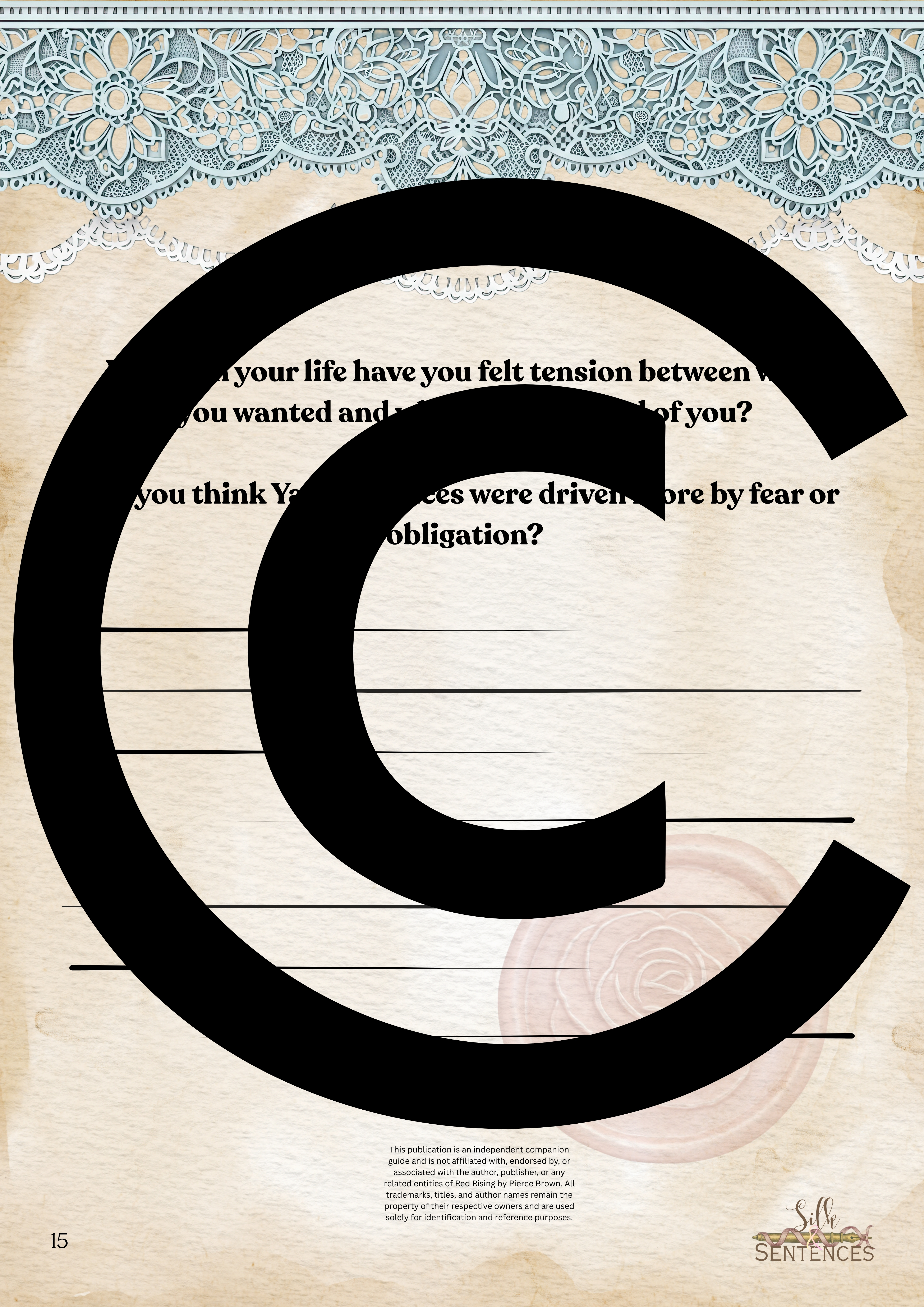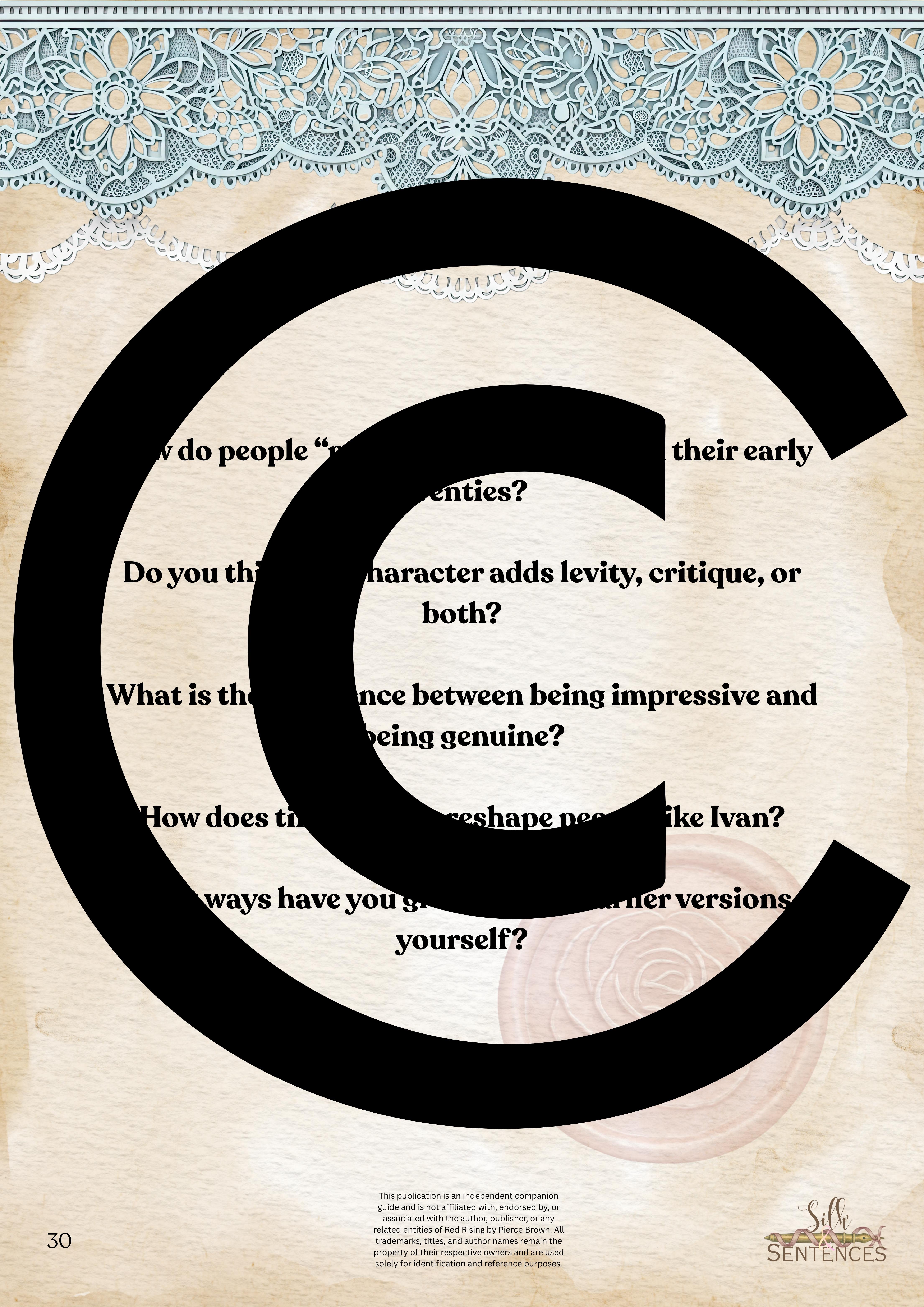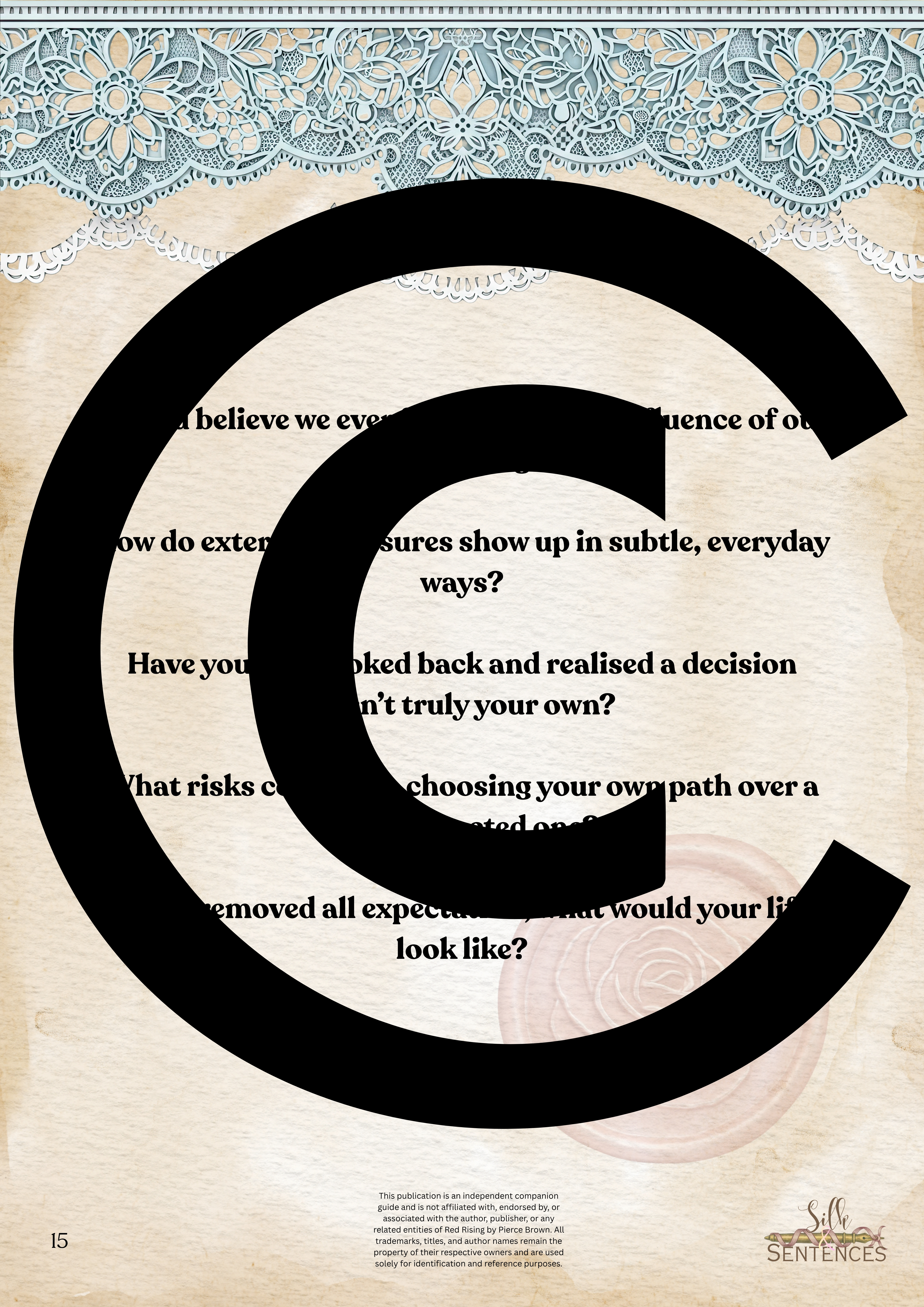 This is an indispensable addition to any Book Club event. Filled with insightful discussion questions, intriguing insights into plot development, emerging themes and character structure, there will be multiple options and avenues to enhance discussion and grow together through the immersion into the accompanying book. Available in conjunction with The Complete Collection, or the Gathering Edition.